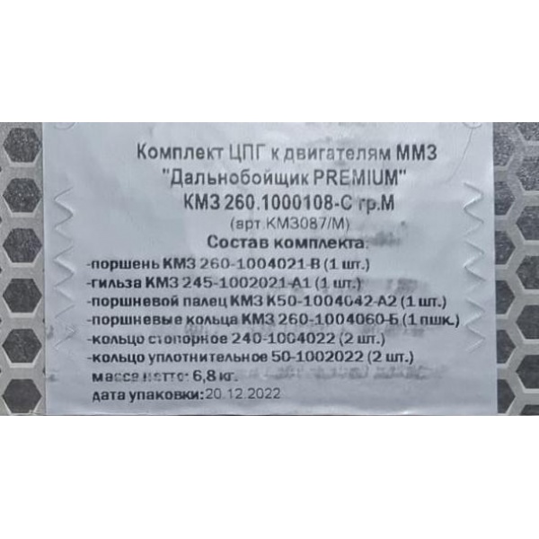 | Наименование | Комплект ЦПГ к двигателям ММЗ Д-260 "Дальнобойщик PREMIUM" группа "М" (КМЗ) |